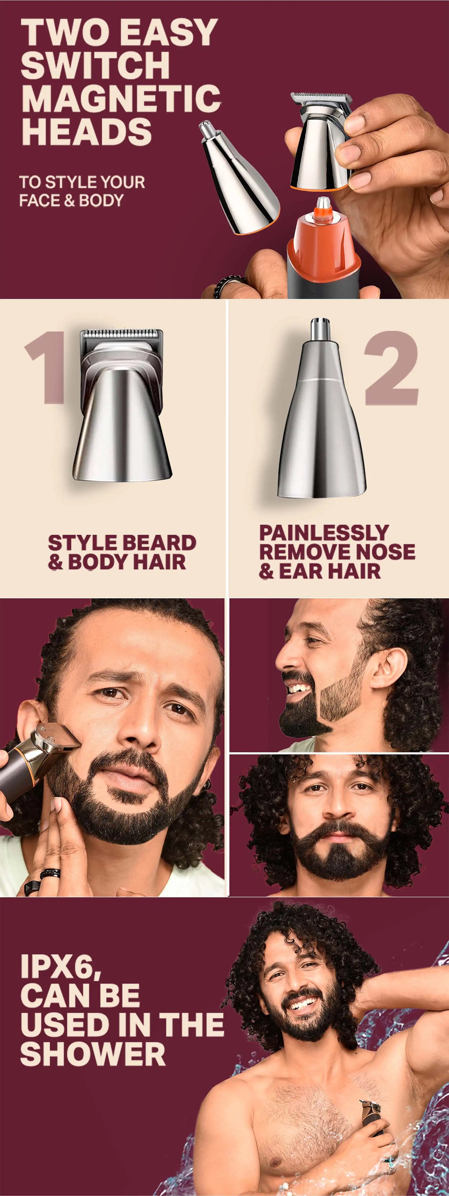 2 Magnetic Body Attachments: 1 Nose and ear head +1 Beard and Body head for hair around your beard, chest, and arms.