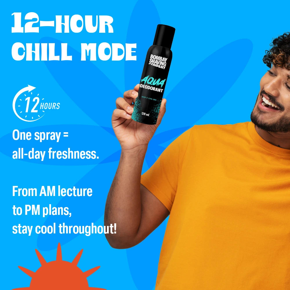 Meet Aqua, a crisp, clean deodorant spray by Bombay Shaving Company that feels like a vacation you can wear. It opens with a splash of seawater, settles into a soft floral note of geranium, and finishes with the earthy calm of oakmoss.