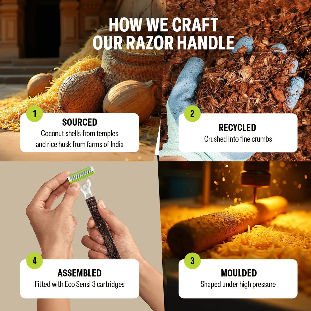 Eco Sensi 3 from Bombay Shaving Company, a razor that harmoniously blends sustainability with superior shaving performance. Its handle is crafted from recycled coconut shells and rice husk, materials sourced responsibly from temples and farms across India.