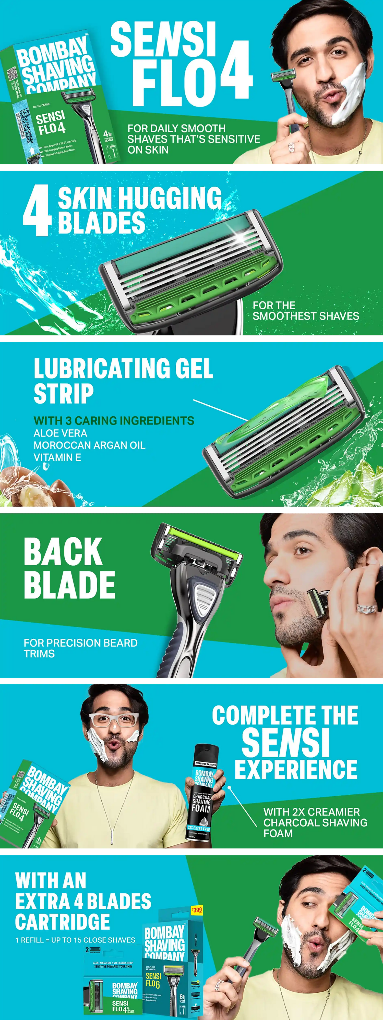 Switch to the perfect balance of a 4-blade SMOOTH and SENSITIVE shaving experience with Sensi Flo 4. This revolutionary shaving razor strikes a balance of sharpness and SENSITIVE glides for an exceptional shaving experience that’s both smooth and gentle on your skin. Up close, it has 4 curved, skin-hugging blades that are designed to seamlessly glide over the contours of your face for an irresistibly smooth and close shaving experience. It has a lubricating strip composed of Moroccan Argan Oil, Aloe Vera and Vitamin E that makes each glide extra gentle and moisturising.