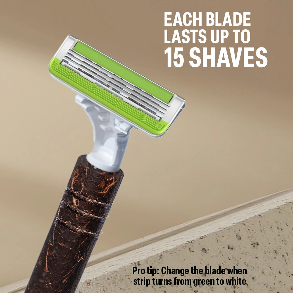 Eco Sensi 3 combines environmental responsibility with exceptional shaving. The handle uses recycled coconut shells and rice husk from Indian temples and farms, creating a durable eco-alternative to plastic. Triple curved blades provide close, comfortable shaves with minimal irritation, while the aloe vera lubrication strip soothes and hydrates skin. Each cartridge delivers up to 15 shaves for cost-effective sustainability, featuring an ergonomic design for comfortable grip and precise control.