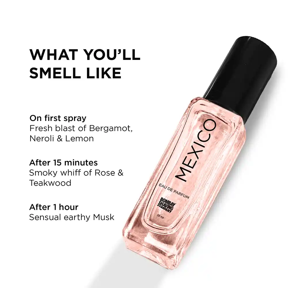 The Mexico perfume from Bombay Shaving Company is an ode to the masculine men who want to leave a lasting impression wherever they go. Mexico is a deep,rich fragrance with sensuality, smokiness & animalistic warmth bottled together ensuring complexity, refinement & longevity - a fragrance that lingers. It combines the fresh, bright & invigorating citrus that uplifts with romantic & earthy notes of rose & teakwood. Musk & Vetiver in the base enhance the overall richness through smoky earthy aroma. It’s perfect for date nights making your occasion a night to remember , where they think about you even when you have left.
