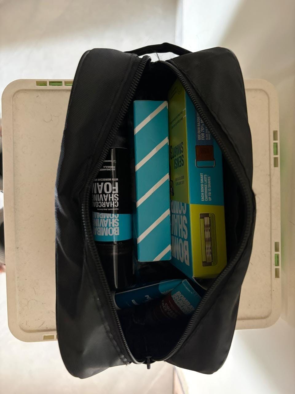 I was looking for something organized for my bathroom and this works. All products are decent quality. The charcoal shaving foam gives good lather. Razor blades are sharp but not harsh on skin. The balm has helped with razor burn I used to get. Perfume lasts through the day. The pouch keeps everything together which is what I needed.