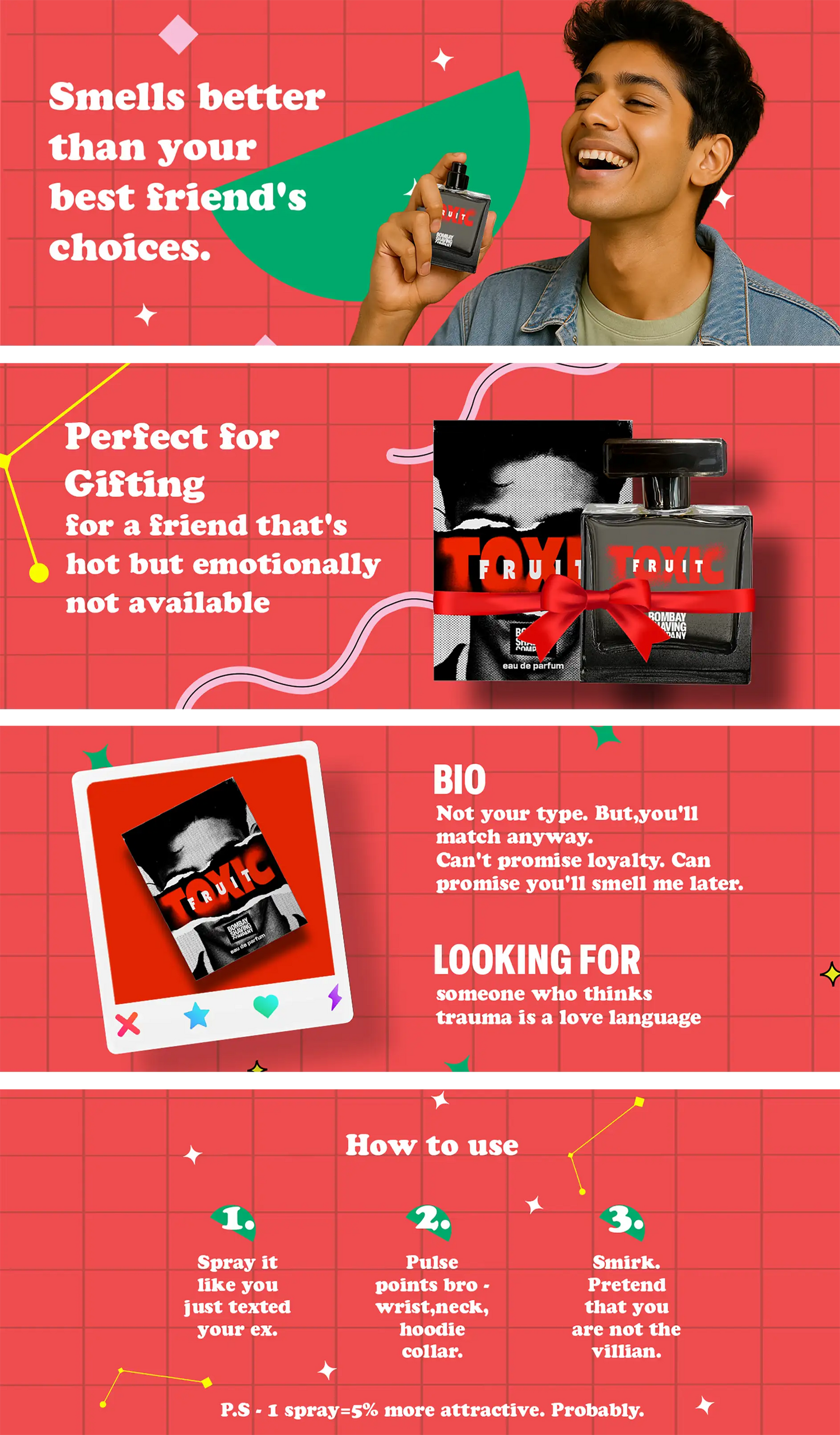As the scent settles, a veil of clean, sensual musk wraps around the fruit, grounding the composition with a soft, skin-like warmth. The result is a bold contrast of playful and provocative-sweet, sharp, and mysteriously addictive.