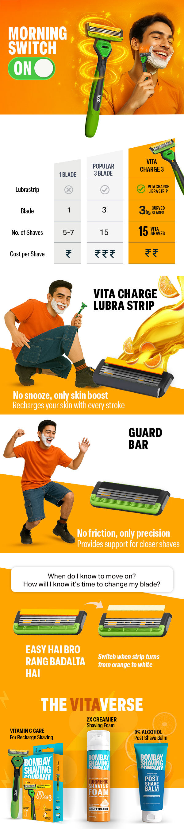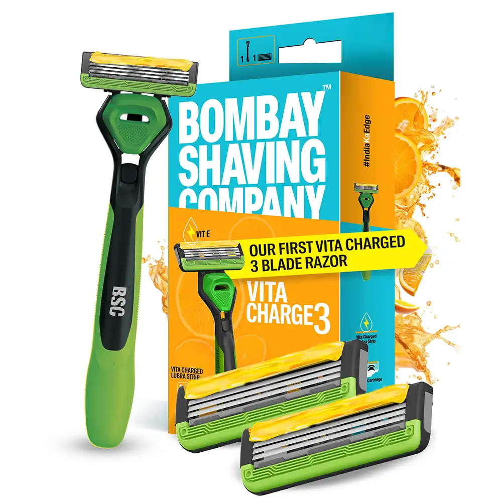 Meet the razor that doesn't just shave, but charges you up. The Vita Charge 3 Razor from Bombay Shaving Company is powered by a Vitamin C-enriched lubricating strip that refreshes your skin with every stroke. It ensures that there are minimal tugs and pulls, while your skin receives the ultimate recharge.